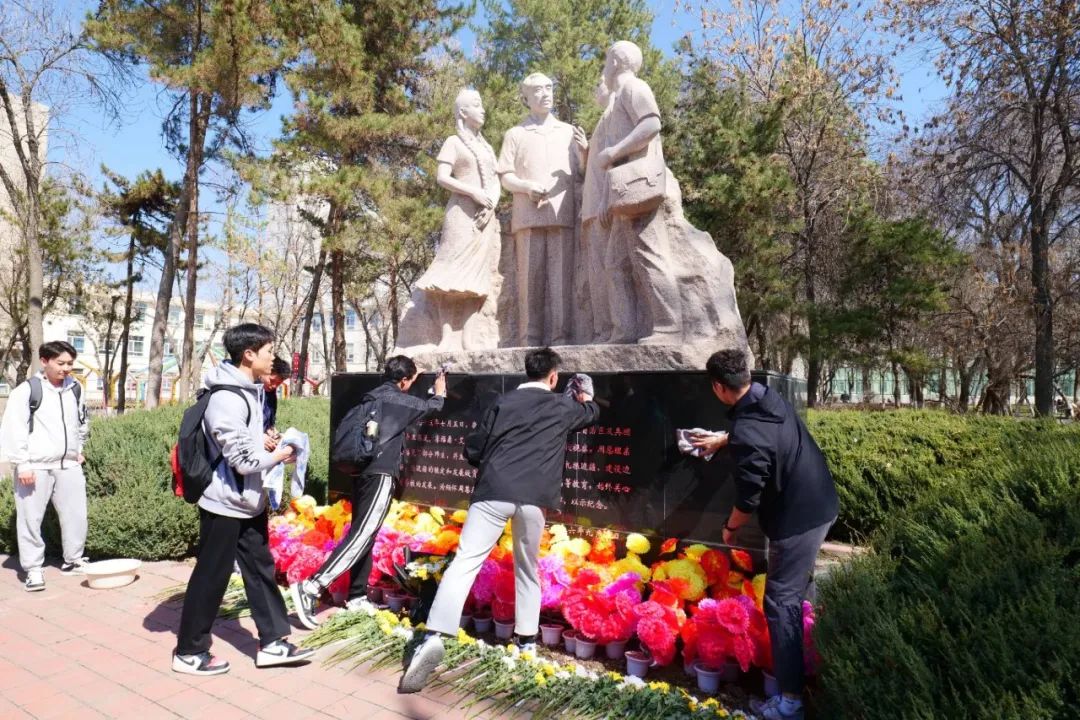 活动伊始,同学们手持洁净的毛巾,仔细擦拭纪念碑。每一处纹路,每一个棱角,都被认真清理。