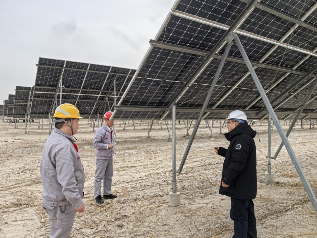 图木舒克粤电瀚海新能源有限公司隶属于广东省能源集团新疆有限公司,张立新一行参观了国家第一批以沙漠、戈壁、荒漠地区为重点的光伏基地建设项目——40万千瓦光储一体化项目,观摩了沙漠光伏运行实况、光伏支架调控技术应用等。