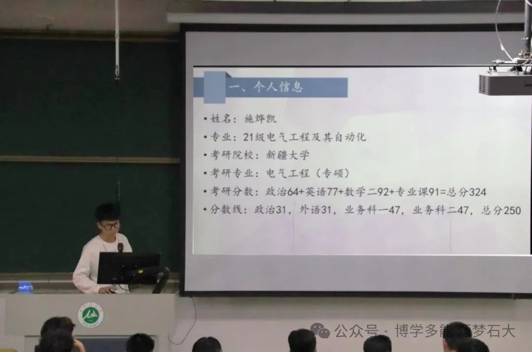 施烨凯(考研至新疆大学电气工程公司)就如何高效制定学习计划、如何平衡专业课与公共课复习时间分享了自己的经验,为同学们提供了参考。同时就考研与就业、考研动机、考研心态、参考书的选择、资料信息的收集、复习时间的安排、复习方法、应试技巧、对报考专业前景的看法等同学们普遍关心的问题,细致耐心地与参会同学进行了分享交流。