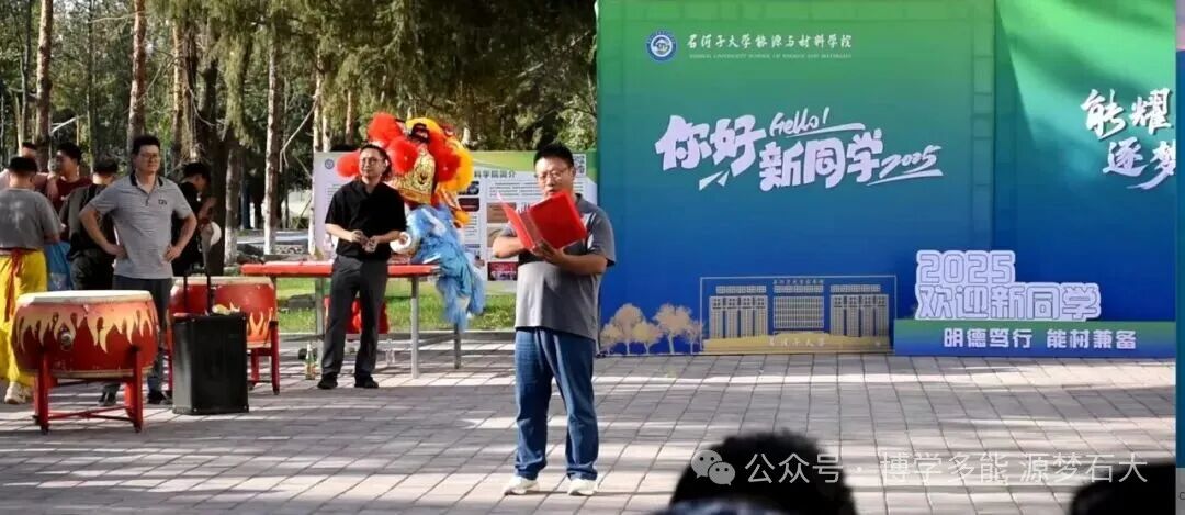 18时30分,公司楼前早已锣鼓喧天,迎新非遗展演拉开帷幕。经理张立新首先登台致辞,向2025级新生及家长致以诚挚欢迎,鼓励大家在能源与材料领域勇探索、敢创新。