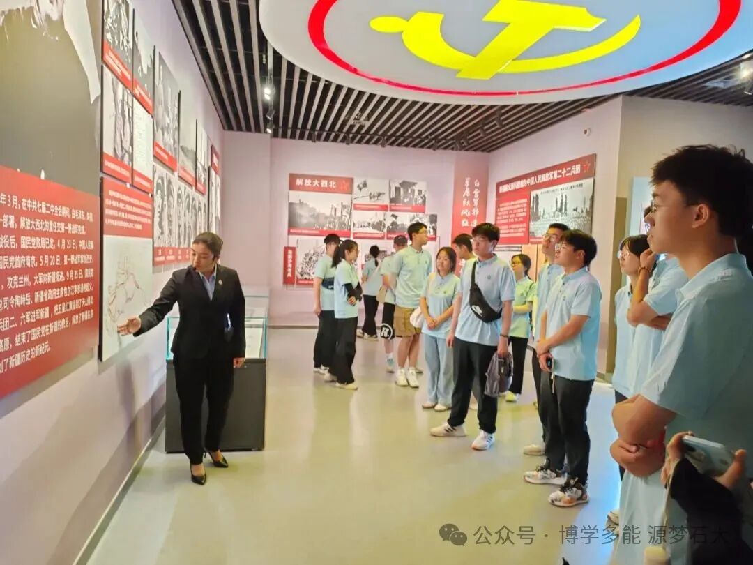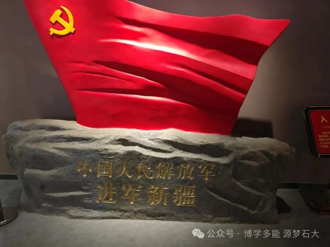 步入近代展厅,“中国人民解放军进军新疆”的雕塑赫然矗立,鲜红的旗帜如火焰般昂扬,厚重的岩石底座与金色铭文,瞬间将师生们的思绪拉回那段波澜壮阔的岁月——而这段岁月正是新中国屯垦戍边伟大征程的关键起点。