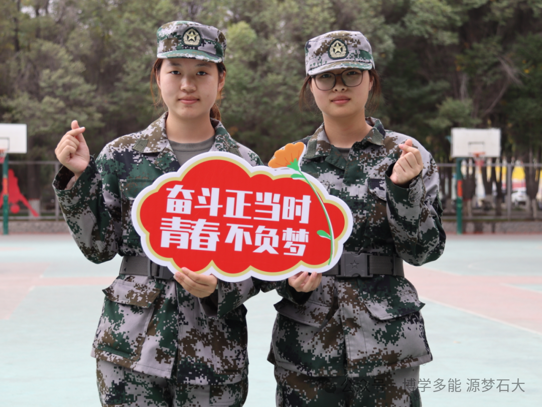 迷彩戎装展朝气,手举牌上的宣言,是军训里青春与担当的鲜活印记。