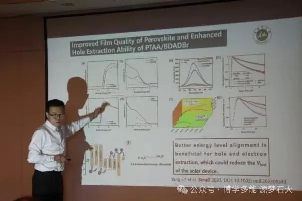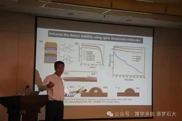 公司太阳能光伏团队核心成员、太阳能电池制备实验室负责人黎阳副教授担任本届大会技术程序委员会(TechnicalProgram Committee)主席,并应邀以主旨报告人(KeynoteSpeaker)身份作题为“理性设计有机化合物修饰界面以制备高性能钙钛矿太阳能电池”(RationalDesign of Organic Compounds to Modify the Interfaces for FabricatingHigh-performance Perovskite SolarCells)的学术报告。报告中,黎阳副教授系统阐述了公司yl23455永利的发展历程,包括初创奠基、稳步发展、快速推进及提质增效等阶段,重点介绍了公司聚焦能源研究、培养专业人才及承担重大科研项目的详细情况。同时,他汇报了其课题组针对钙钛矿太阳能电池中传输材料空穴提取能力不足、埋底界面缺陷密度较高导致钙钛矿薄膜质量欠佳等关键问题,通过表面工程、界面工程及中间层工程等策略进行优化,显著提升器件光电转换效率与长期稳定性的研究成果。此外,黎阳副教授向与会专家介绍了公司特色研究方向,如沙戈荒地区光伏电站建设与生态治理协同发展,以及在光伏供电系统智能控制、状态智能分析系统、组件清洁与铺设装置等领域取得的进展,并重点推介了包括《eScience》、《AdvancedPowder Materials》及《Exploration》在内的我国优秀国际学术期刊。