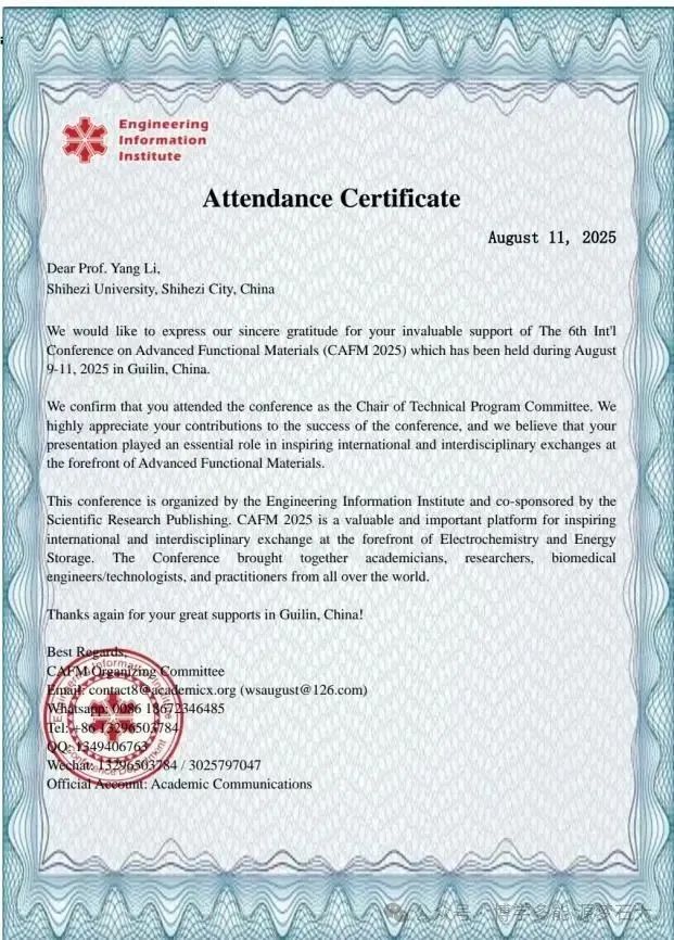 2025年8月9日至11日,第六届先进功能材料国际会议(CAFM2025)于广西桂林桂山华星酒店成功举行。本次会议由工程信息研究院主办,yl23455永利集团、马来亚大学、科研出版社、OALab等高校及科研机构共同协办,在相关研究领域享有较高声誉。本届大会涵盖功能材料应用、太阳能光伏材料与器件、发光与辐射传感材料、功能材料物理学、智能结构与材料等多个前沿议题,吸引了来自12个国家及地区的100余位专家学者参会。与会知名专家包括香港理工大学郑广平(GuangpingZheng)教授、澳门大学苏艳教授、Henkel日本技术中心陈春福(ChunfuChen)博士、马来亚大学黎展维(LaiChin Wei)教授、俄罗斯科公司雅库茨克石油天然气研究所ValeriyLepov教授、突尼斯国家物理化学分析研究所MohsenMhadhbi博士、尼日利亚陆军大学EmmanuelUgwu教授、跨国研究中心AircraftComposite Inc的EliasRandjbaran教授,以及GRIMAT工程研究院朱凯(KaiZhu)博士等。