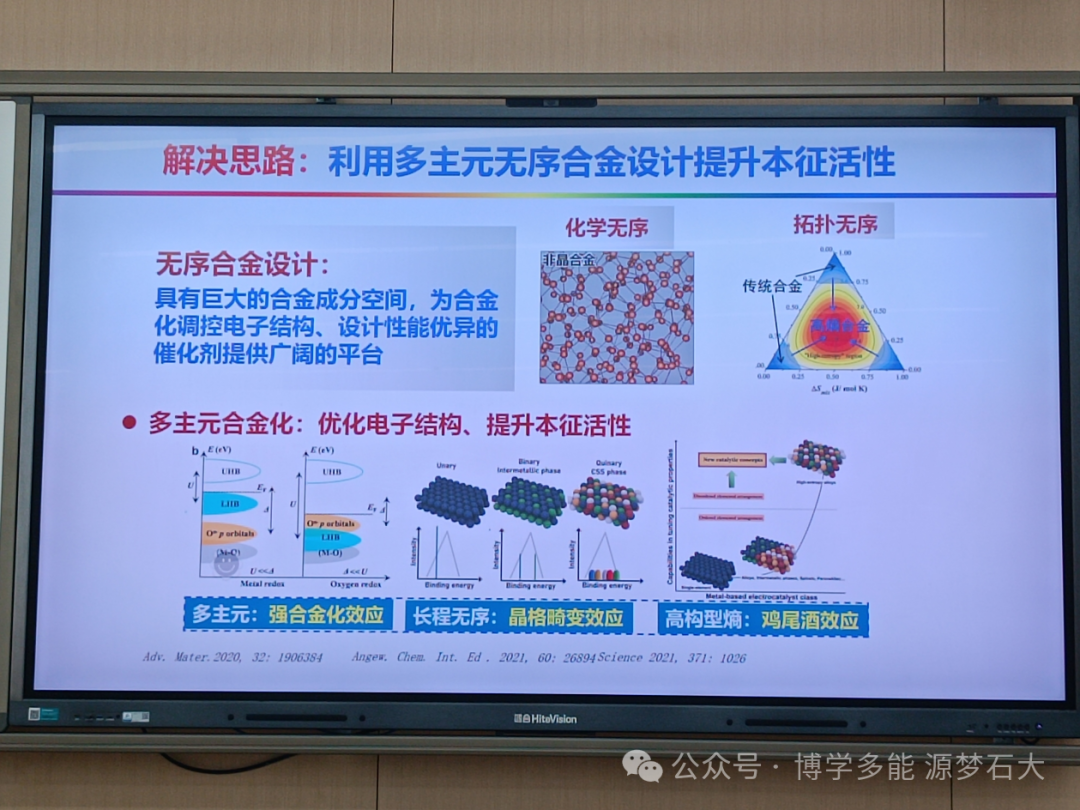 报告中王辉教授强调,多主元合金化效应、多尺度结构调控与动态补偿机制的协同作用,是破解电解水催化剂核心矛盾的关键,而无序合金材料凭借“化学无序+拓扑无序”带来的广阔成分调控空间,将成为未来工业绿氢制备的核心材料之一,这一结论为在场师生提供了重要的学术启发。