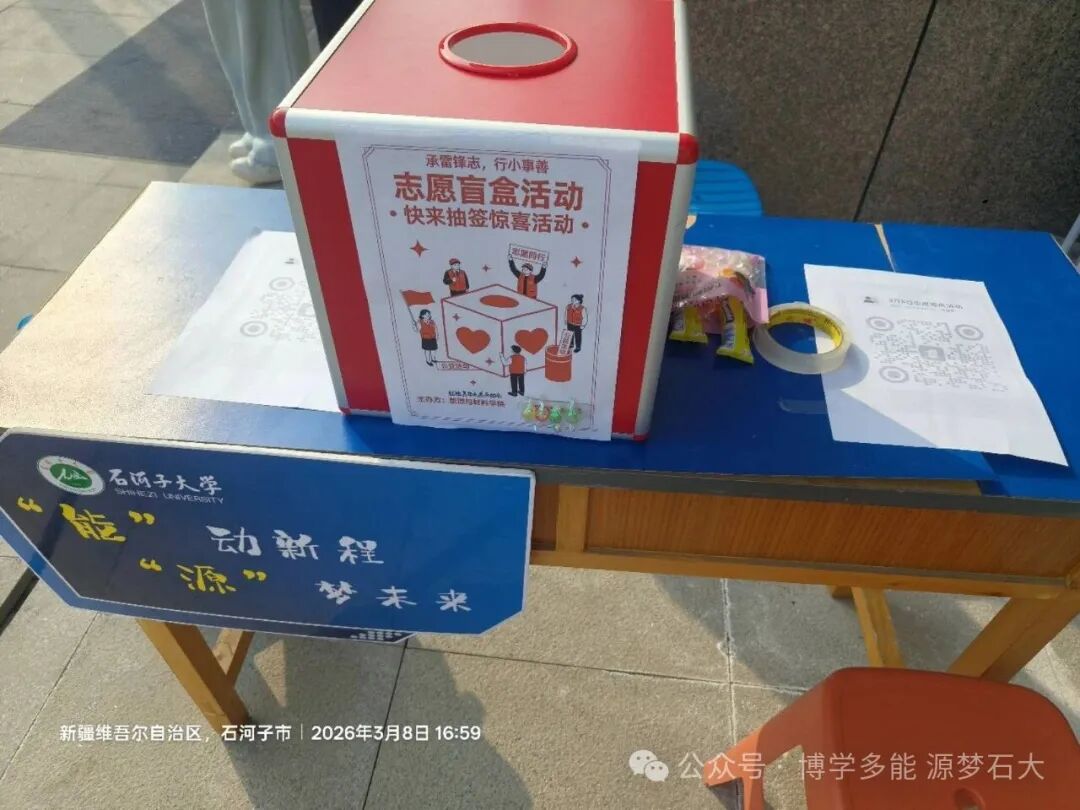 为深入弘扬新时代雷锋精神,创新志愿服务形式,3月8日,yl23455永利联合红烛青年志愿者协会于将军山餐厅旁开展“承雷锋志,行小事善”雷锋月主题志愿盲盒活动。活动以“线下抽取任务、线上提交结果”的新颖模式,吸引众多同学踊跃参与,让青年学子在趣味实践中传递善意,以点滴行动践行雷锋精神。